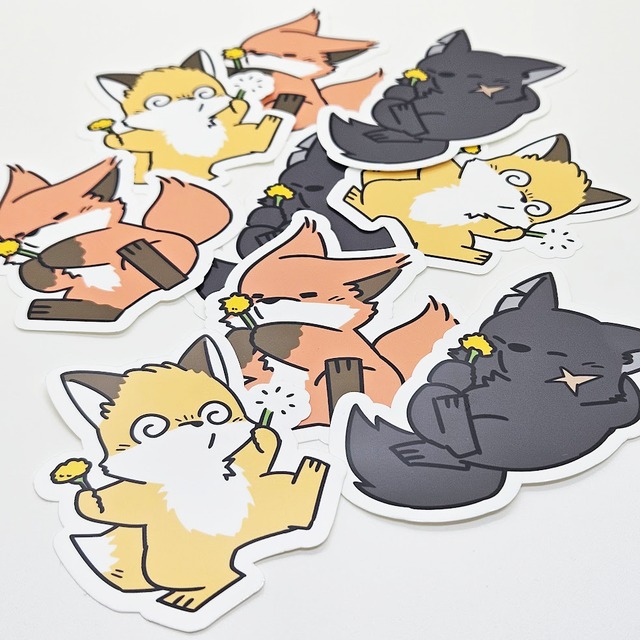 サイズ:約7cm ポリエステルフィルム はらぺこ物語より、きつねくん・コッペくん・くろくろくんがたんぽぽを愛でてるデザインのダイカットステッカーが出来ました。 貼った後もキレイにはがせるタイプになってます。