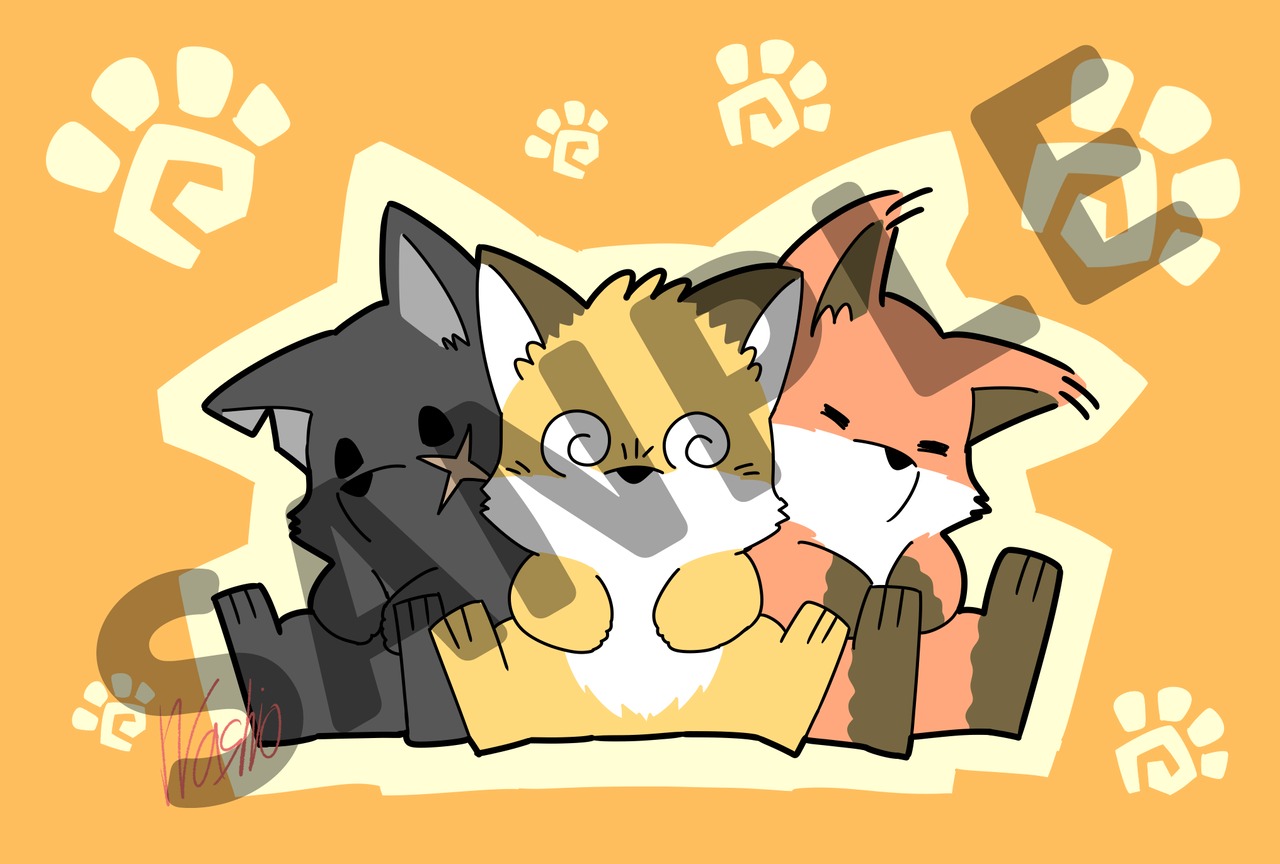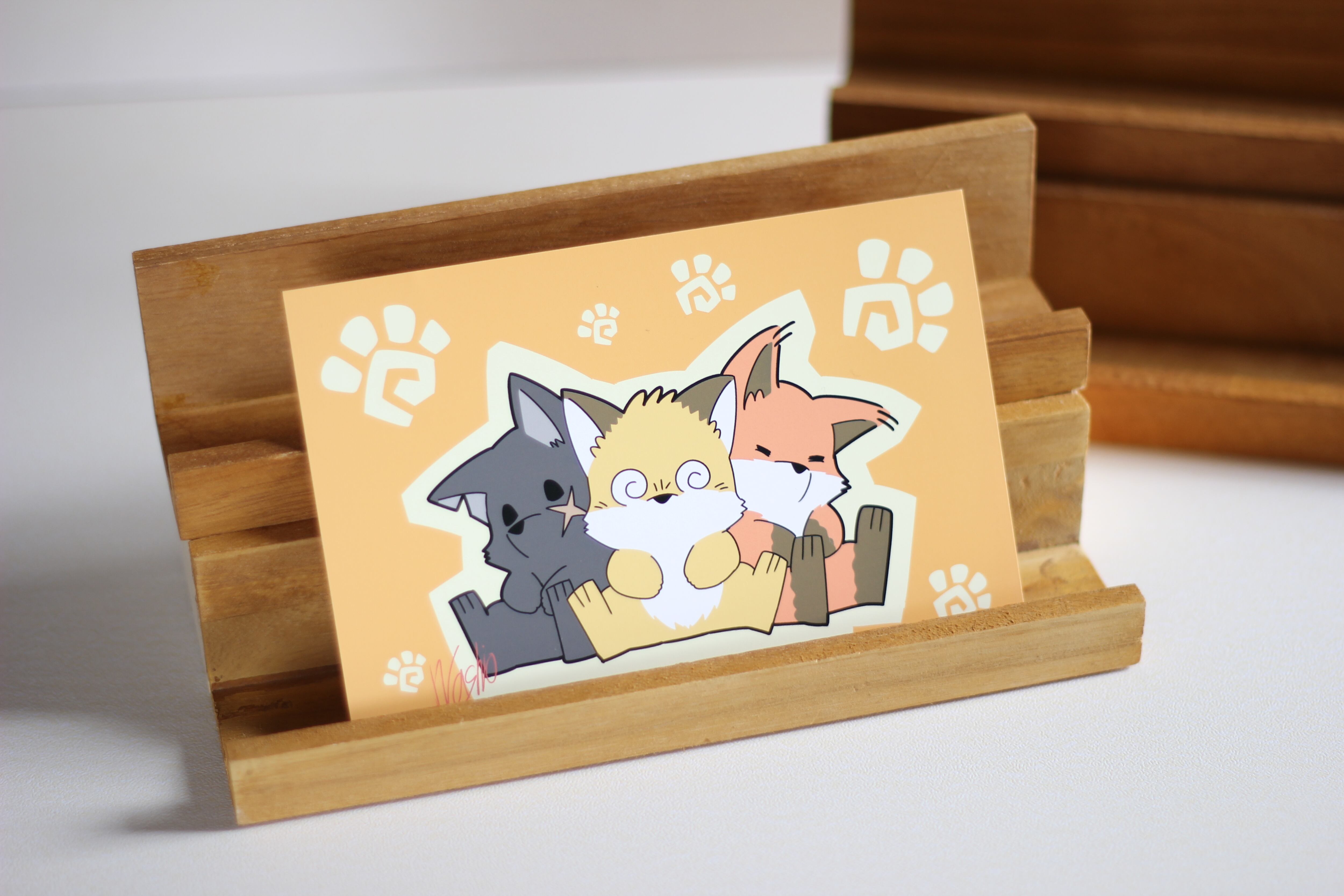 きつねくん、コッペくん、くろくろくんの仲良しトリオがぎゅぎゅっと詰まったポストカードです。
