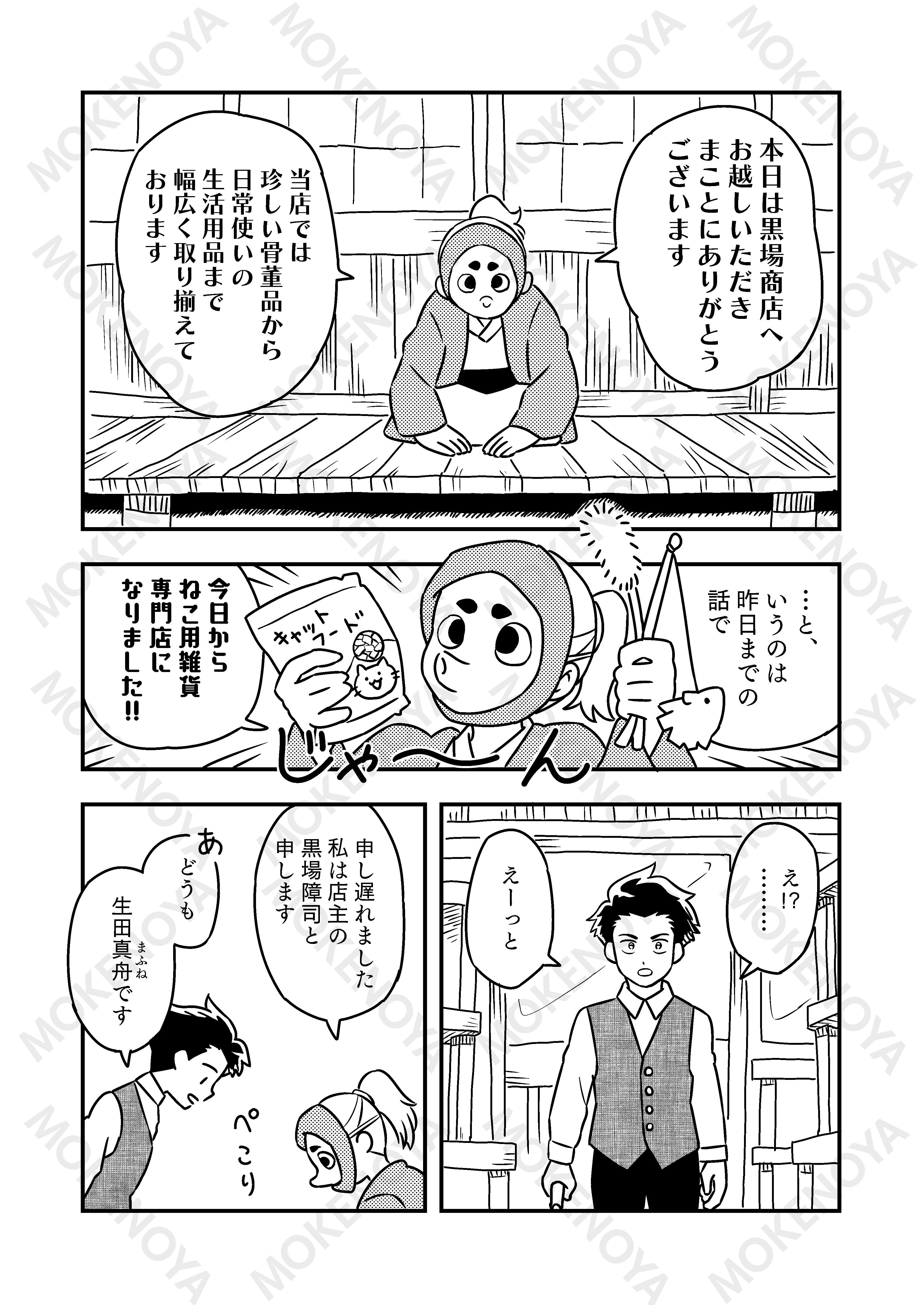 ひょっとこ面の店主とちょっぴり変わった生き物のお話。